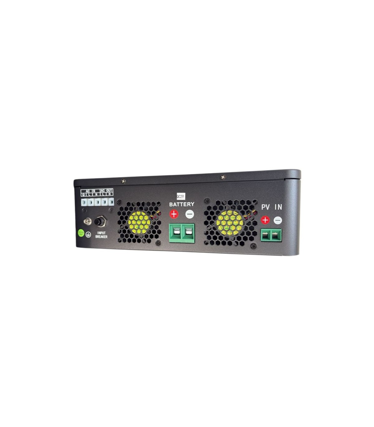 Este es un inversor / cargador multifuncional, que combina funciones de inversor, cargador de baterías y UPS para ofrecer soporte de alimentación ininterrumpida. Su pantalla LCD permite un fácil acceso y configuración de operación por el usuario, como la corriente de carga del banco de baterías y su voltaje, la prioridad de las fuentes de la red, solar y baterías. Posee un voltaje de entrada aceptable para diferentes aplicaciones.